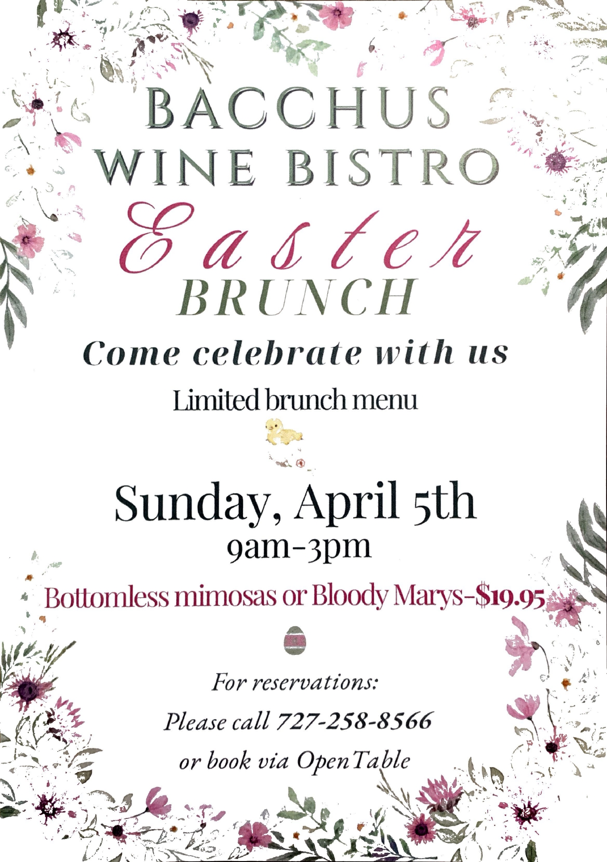 Bacchus Wine Bistro is a relaxed oasis of Old World charm nestled within St. Pete’s expanding modernity. Our seasonally changing menu offers something for everyone - including classic dishes like French Onion Soup and Foie Gras Torchon, alongside contemporary options such as Tuna carpaccio and Tartare de Boeuf. We are also known for our lavish Charcuterie boards with the highest quality meat and cheese options from all over the world. The wine library, watched over by the famed Vitale Bros’ Bacchus mural, boasts nearly 100 Sommelier curated selections from France, Italy, Spain, the US, and other notable countries. We also offer several delicious imported beer selections, curated wine-based cocktails and a hospitality experience you will never forget! Join us today!